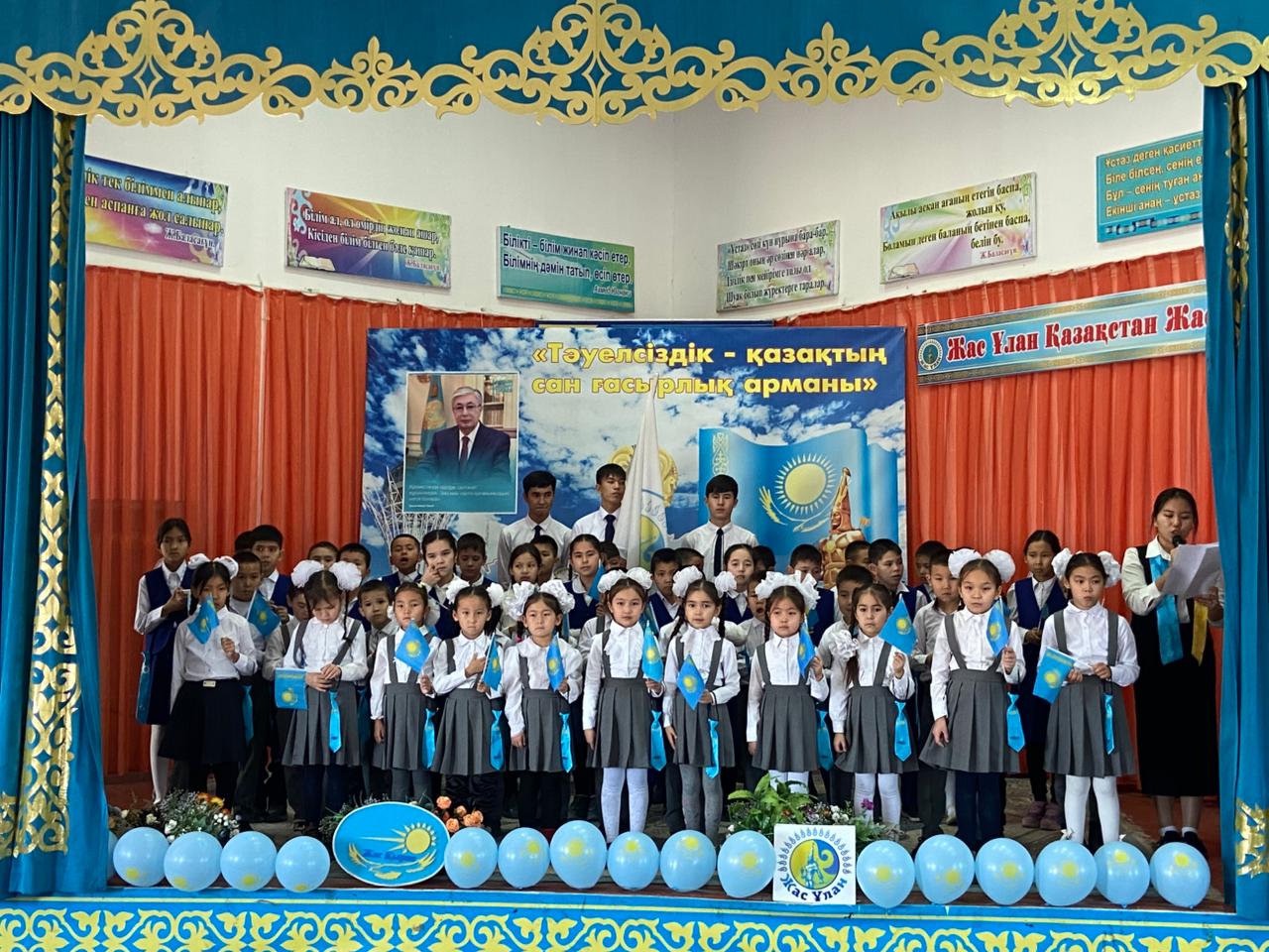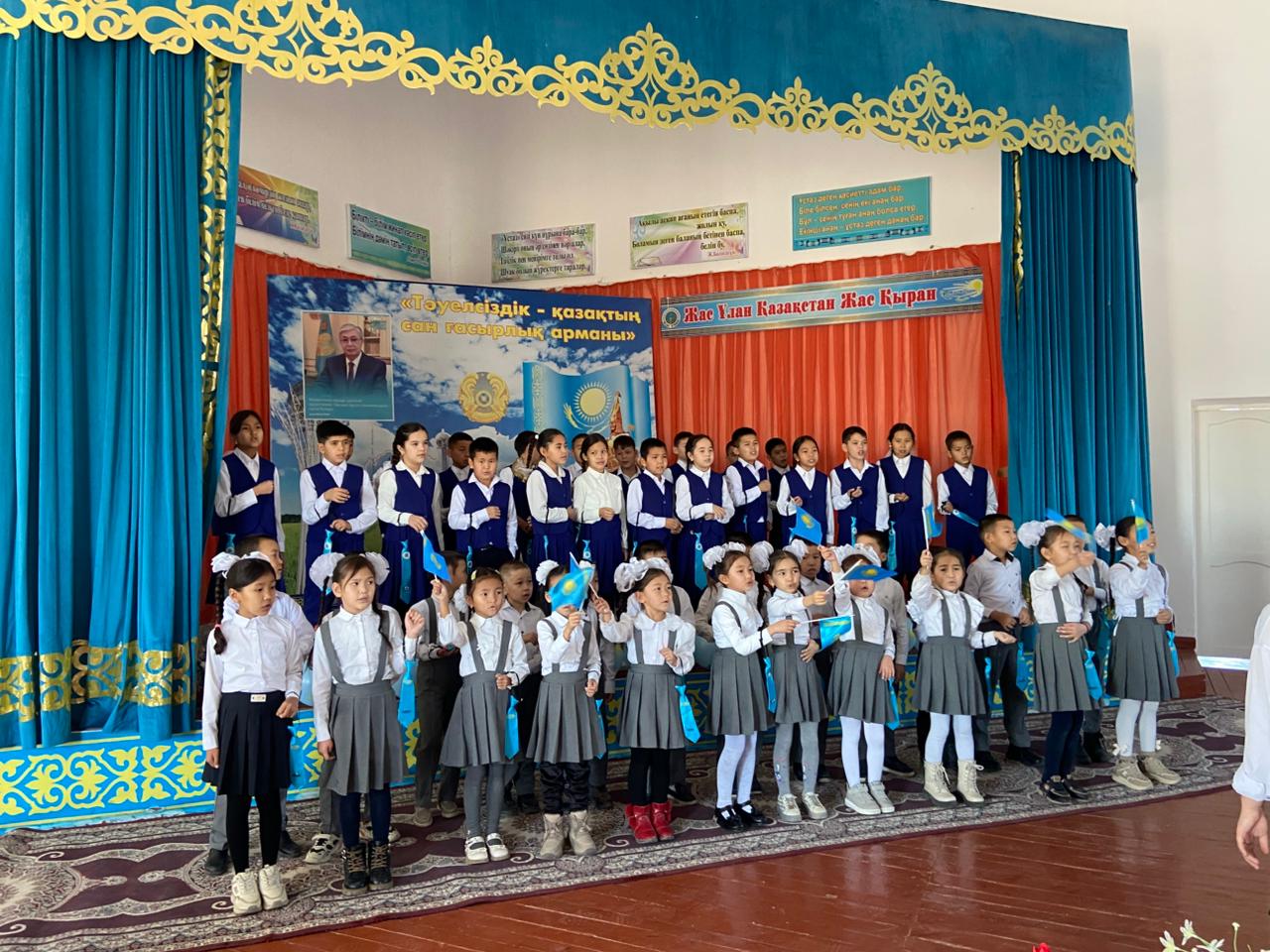 Оқушылар патриоттық сезімді ұлықтайтын ән-музыкалық нөмірлер орындап, өлеңдер оқып, салтанатты ант қабылдады. ![]()